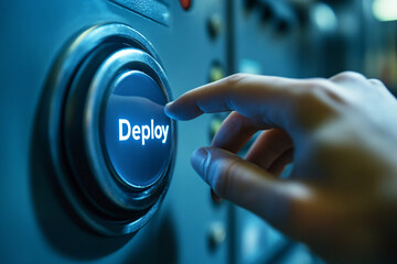 Deploy Button Press - A close-up shot of a finger pressing a glowing "Deploy" button on a futuristic touchscreen interface, suggesting software deployment or launch.