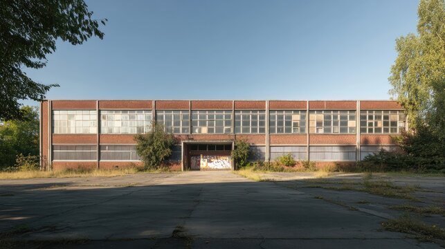 Abandoned factory building with large windows and overgrown vegetation on a clear day showcasing urban decay and industrial architecture