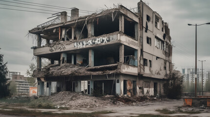 derelict houses and abandone garage on a residential street with boarded up windows and decaying crumbling walls