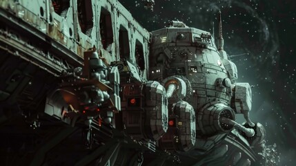 A derelict spaceship floats amidst cosmic debris, showcasing a haunting beauty in the depths of space.