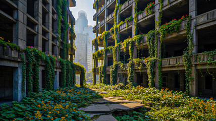 Overgrown abandoned building with plants and flowers in a postapocalyptic city