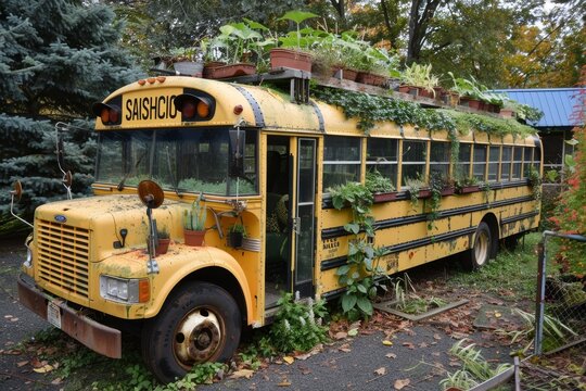 An old school bus covered in plants, transformed into a greenhouse in a state of decay, A school bus turned into a greenhouse with plants growing on the roof and sides