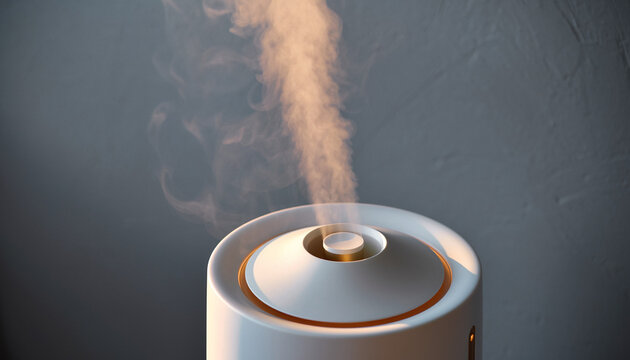 室内で稼働するシンプルデザインの加湿器と蒸気