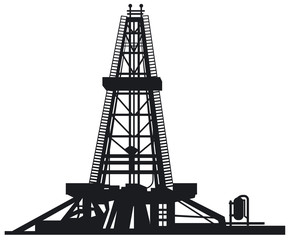 Oil field over sunset. Vector illustration. Gas industry. Dark silhouette drilling rig.