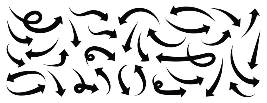 Curved arrow icons. Hand drawn wavy arrow set. Black arrows set. Curved arrows. Arrow sign. Flat style icons