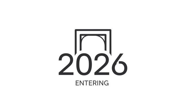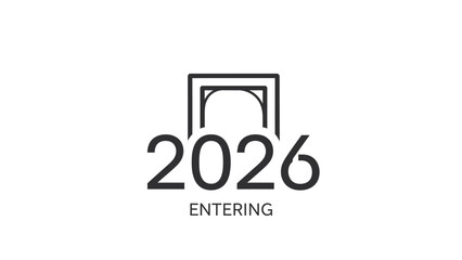 A minimalist black and white graphic illustration of the year 2026 with an archway design on a clean white background.