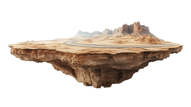 Fantasy floating island with soil surface and mountain isolated on white, surreal flying island with sand ground 3D illustration