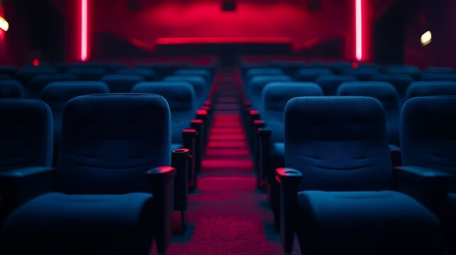 A deserted movie theater featuring rows of plush seats illuminated by striking red and blue neon lights.