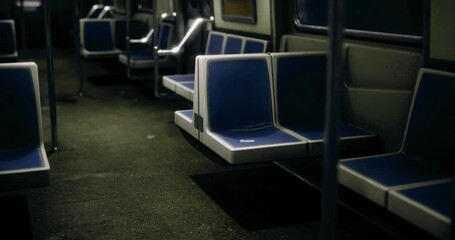 The interior of a deserted subway train, highlighting blue seats and dim light fixtures. The quiet atmosphere suggests late night travel, emphasizing solitude within the urban setting.