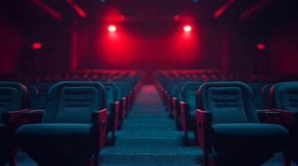 A deserted movie theater featuring rows of plush seats illuminated by striking red and blue neon lights.