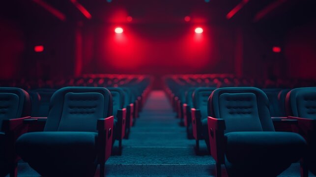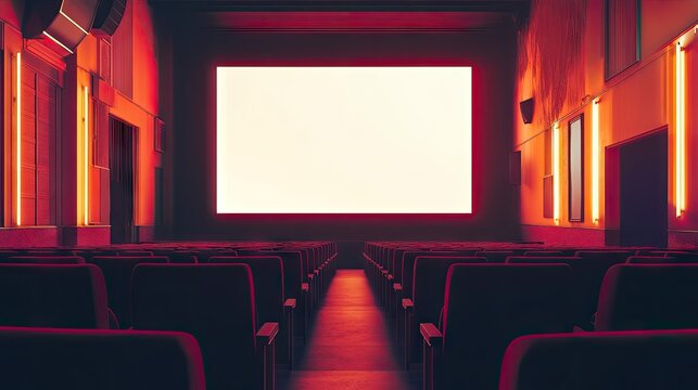 A deserted cinema hall with clean, red seats and a vast blank screen, awaiting the next screening, illuminated by soft lighting.