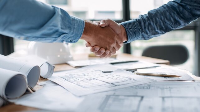 Business handshake over blueprints on office desk. Professional consultation between energy consultant and business client in office setting.