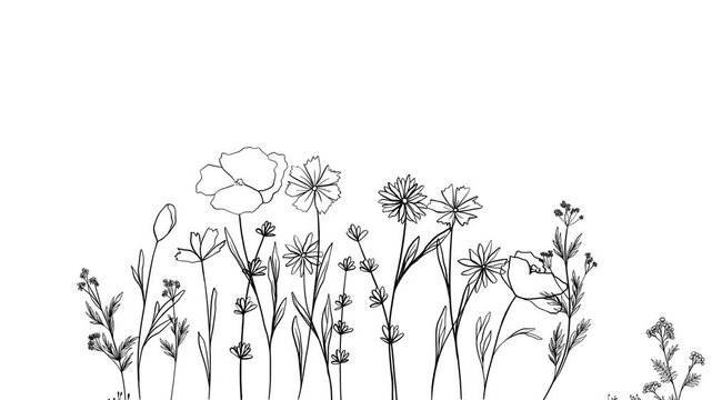 Horizontal animated moving banner blooming going flowers and leaves line illustration on white. Spring floral backdrop. Botanical design field wild flowers. Camomile, bluebells, poppy, medicine herbs