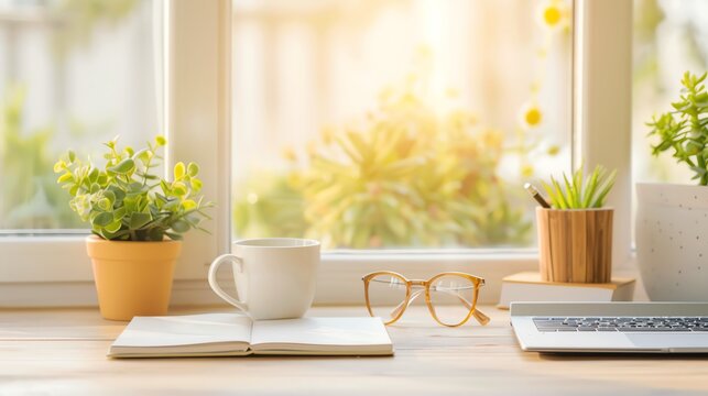 Cozy cafe ambiance with laptop, notebooks, and coffee, surrounded by lush green plants, perfectly capturing the essence of a remote work lifestyle and modern flexibility.