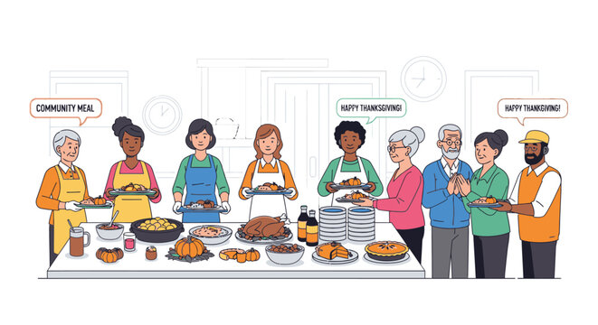 A heartwarming flat design illustration depicting a diverse group of people exchanging beautifully wrapped prize boxes in a cozy, snow-covered winter village.