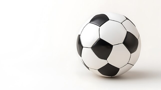 A soccer ball in a stationary position on a bright white background, displaying classic black-and-white panel design