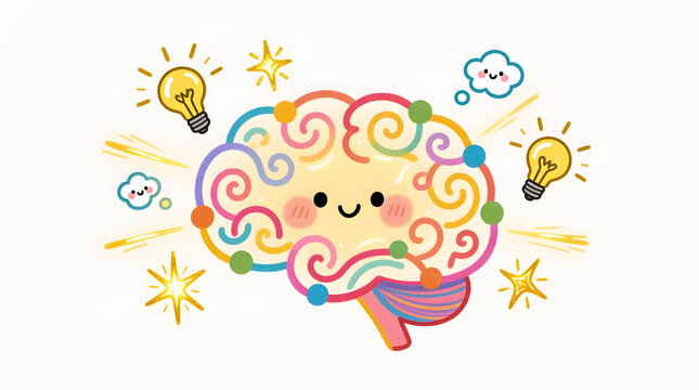 A colorful, friendly brain doodle radiates glowing lightbulbs and ideas, symbolizing artificial intelligence and creative thought.