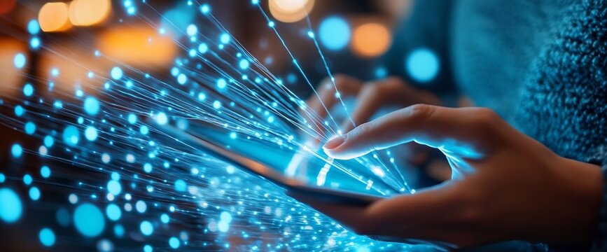 Digital interface with a glowing fiber optic effect on a smart device screen displaying data