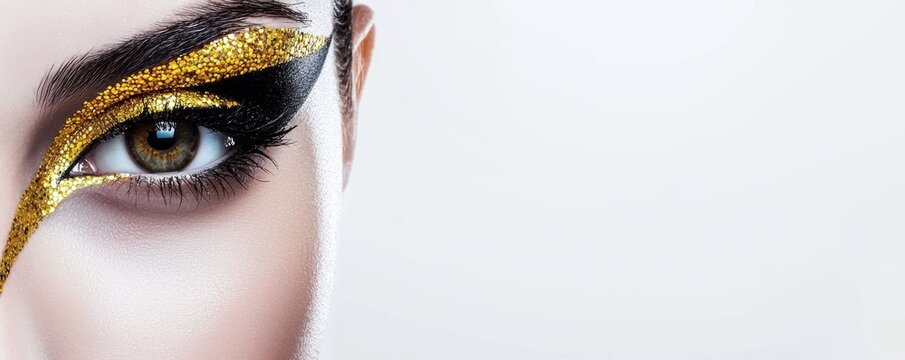 Creative beauty design, bold black eyeliner with rich gold glitter, perfectly shaped eyebrows, studio lighting