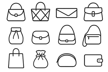 Fashion Bag Icons. Fashion bags outline icons: handbag, designer tote, clutch, satchel, bucket bag, mini purse, shoulder bag, crossbody, shopping bag, jewelry pouch, makeup bag,