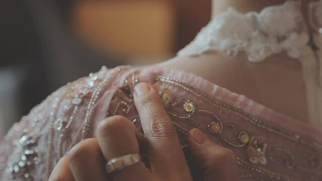 Fashion designer working on wedding dress for bride in their atelier
