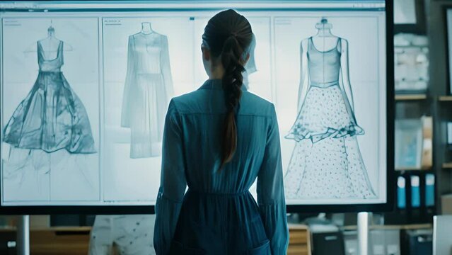 A designer standing in front of a large touchscreen monitor using a stylus to sketch and tweak details on a digital rendering of a dress.
