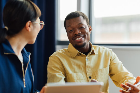 three young asian worker chatting about their product at work