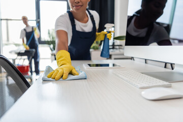 cropped view of bi-racial woman in rubber gloves cleaning office desk near gadgets and colleague on blurred background.