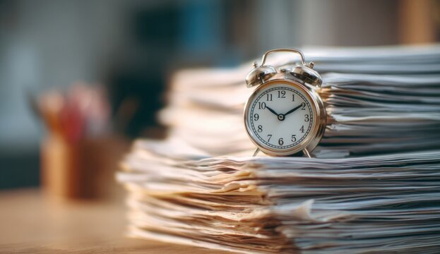 An alarm clock sits atop a stack of papers on a desk with a cup of writing utensils in the background