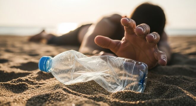 Close-up of desperate man's hand reaching for plastic water bottle on sandy beach, bright sunlight, survival concept, urgency