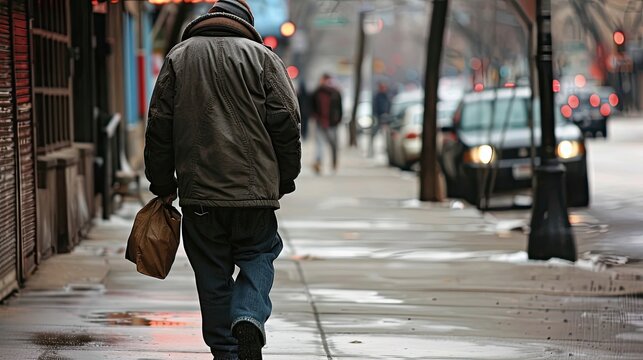 Low-wage workers face challenges of poverty despite working. Lonely poor man in a crowded city. Poverty, sadness, cityscape, man with a package, benefits. Generative by AI