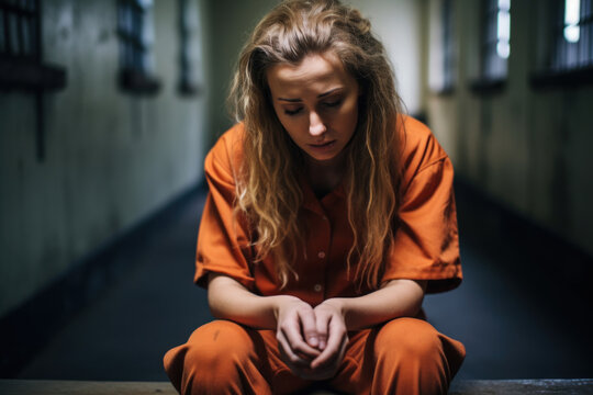Seated in dejection, a woman inside jail wears a sorrowful countenance