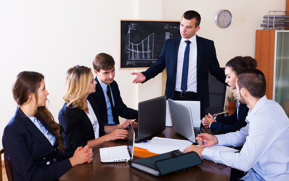 An angry boss walks and shouts into a megaphone at his young female employee. Dictator. Despot. Conflict