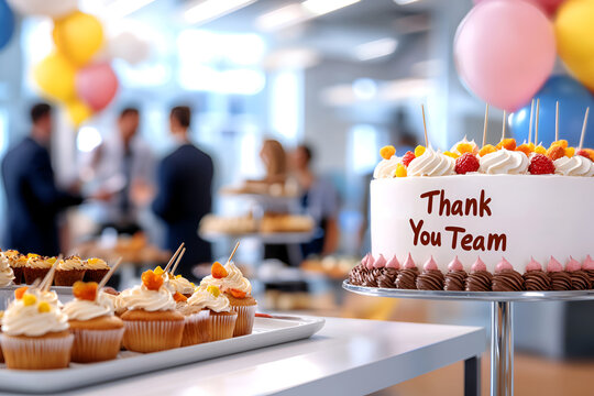 Team appreciation event with thank you cake and cupcakes in an office setting