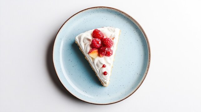 Raspberry cake slice on blue plate, white surface, delicious dessert for food blog
