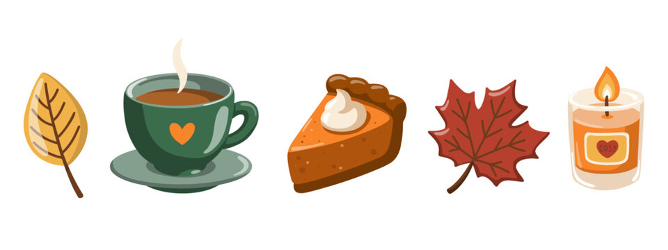 Fall illustration set with hot drink in cup, pumpkin pie, burning candle and autumn leaves. Cartoon vector illustration