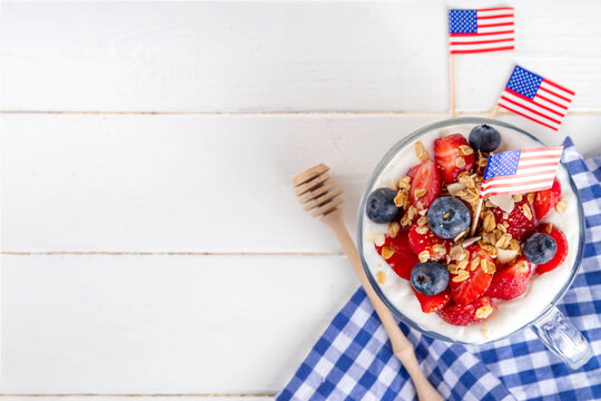 USA patriotic breakfast or brunch simple recipe idea, layered granola dessert, or overnight oatmeal in glass decorated with white whipped yogurt, blue and red berries and american flag
