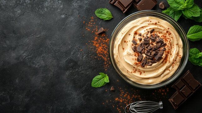 Decadent texture of rich dark chocolate ganache and whipped topping for dessert inspiration