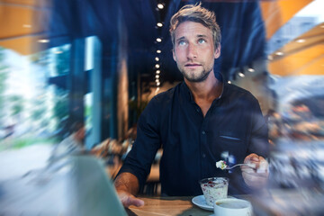 Young businessman in a cafe eating muesli