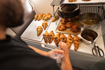 Baker finishing croissants with chocolate and pistachio in a bakery