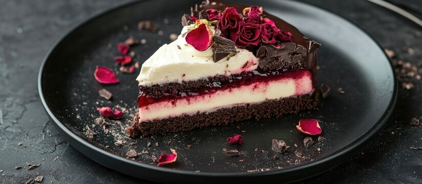 Elegant chocolate cake slice with raspberry sauce and rose petals on black plate showcasing gourmet dessert presentation
