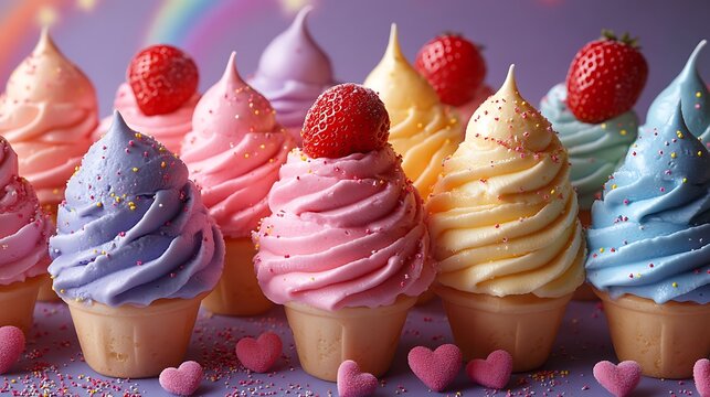 Pastel dessert themed seamless design with ice cream strawberries hearts stars and rainbow