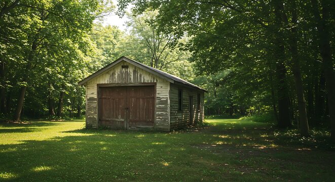 Modern dark wood detached garage with double doors illuminated at dusk.
