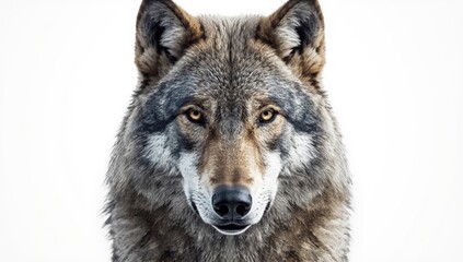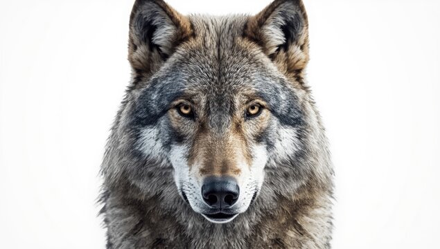 Portrait of a timber wolf with detailed fur and piercing eyes on a plain white backdrop, wildlife conservation focus
