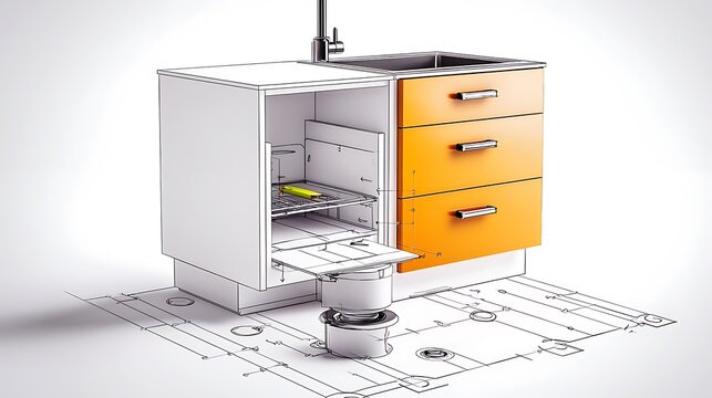 Modern kitchen cabinet design showcasing open drawers and detailed blueprint layout