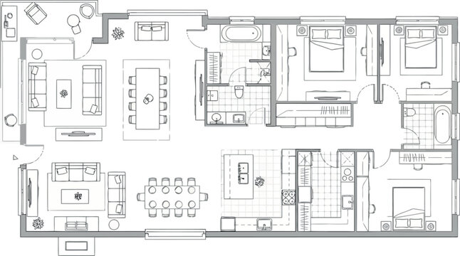 Vector art of detailed architectural floor plan of a modern house with multiple rooms and furniture
