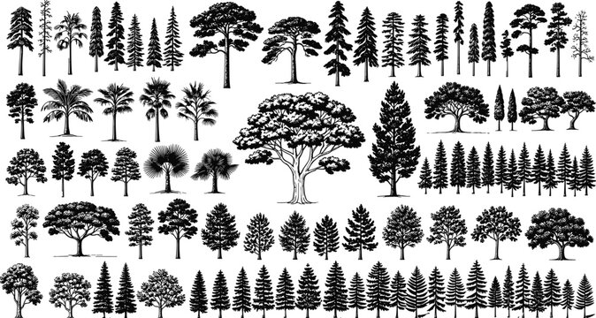 PrintDiverse tree silhouette collection, detailed forest plant illustrations, natural landscape vegetation elements, botanical foliage icons for design and creative artwork