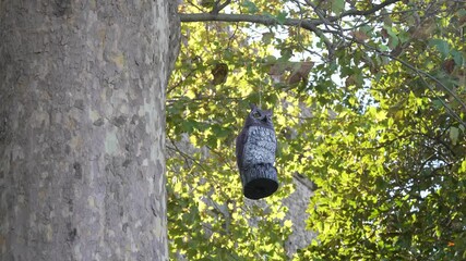 Statue of a wooden owl hanging from a tree and swaying in the wind on a sunny day
