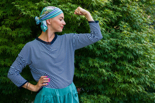 Beautiful young positive female cancer patient wearing headscarf outdoors portrait. Mental health, life balance, mindfulness and strength concept.