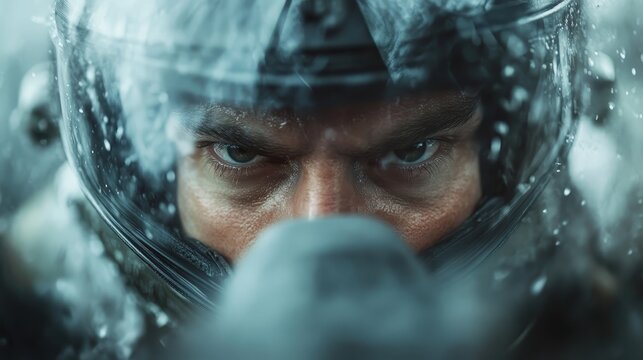 This striking image captures the intense gaze of a soldier in a helmet, revealing determination and focus amid a challenging, icy environment, showcasing resilience and bravery.